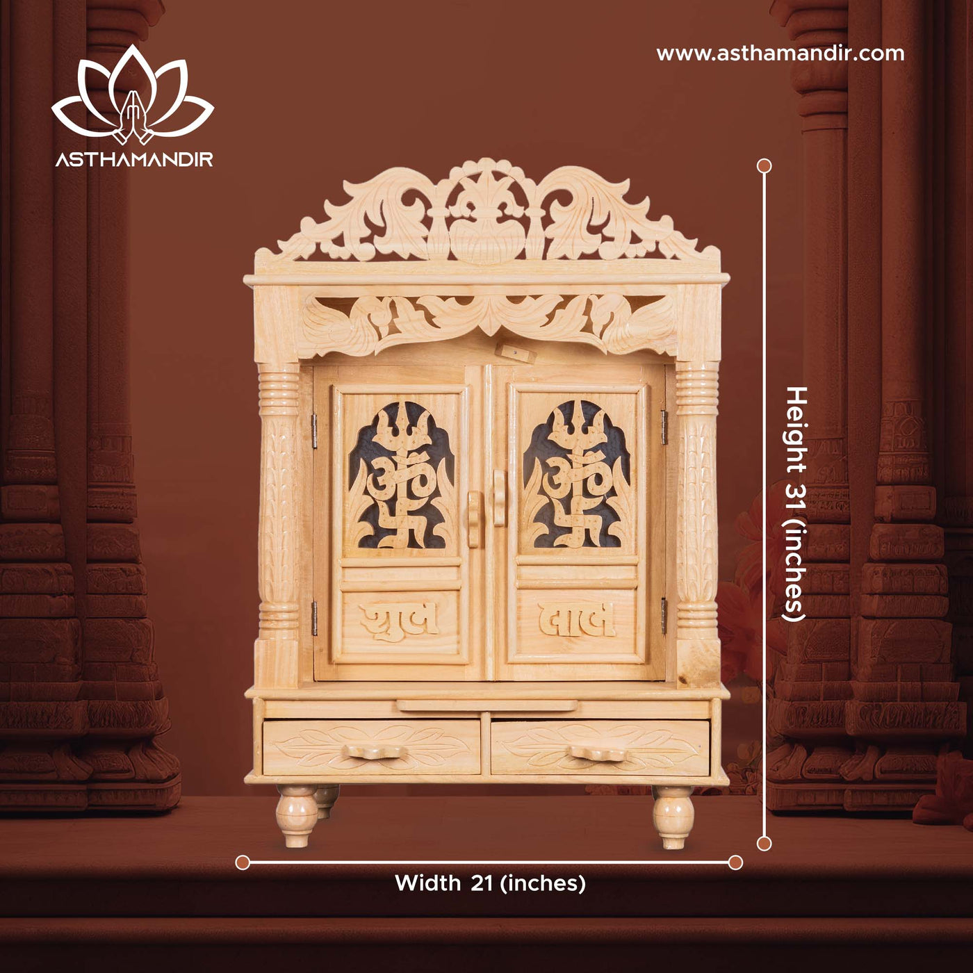 This beautiful mandir features intricately carved double doors with divine cutwork patterns. The side panels include artistic jaali (perforated) detailing for ventilation. The top showcases an ornamental shikhar with floral and diya motifs. Inside, a pull-out aarti tray and spacious sanctum enhance convenience during prayers.